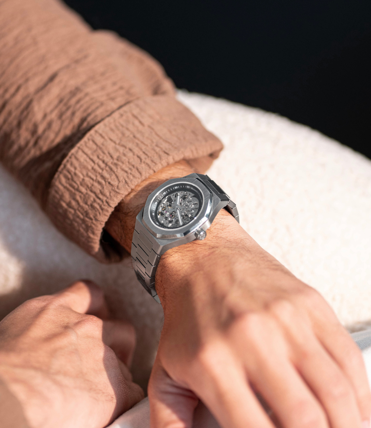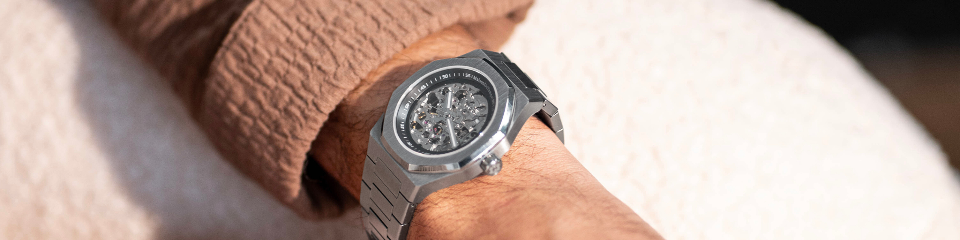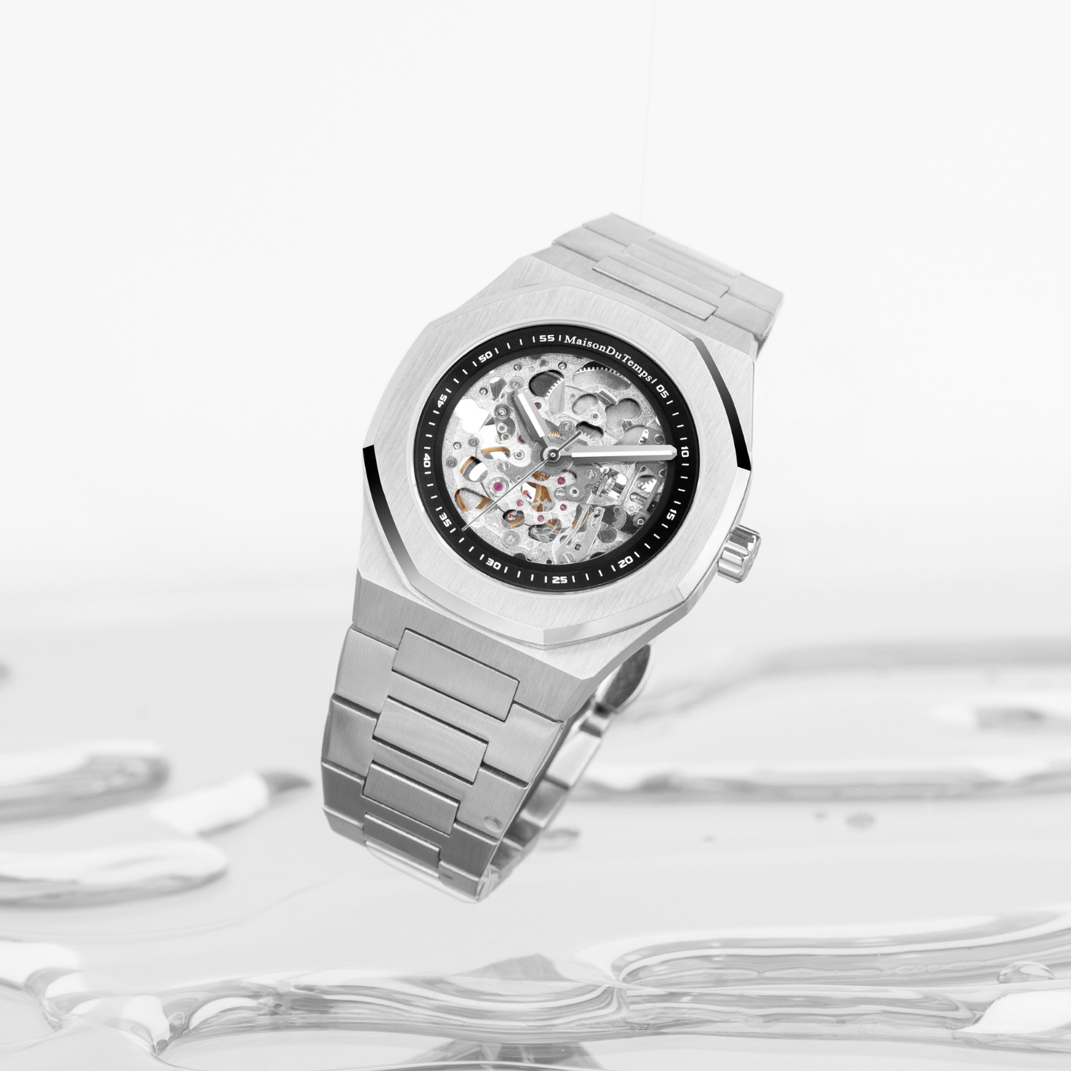 Montre automatique MTBeta Skeleton Miyota de MaisonDuTemps : Boîtier en acier 316L de 40 mm, équipé du mécanisme Miyota 8N24. En acier 316L, lunette octogonale et verres saphir. Étanche jusqu'à 100m avec couronne et fond vissés. Choisissez entre un bracelet en acier 14mm ou en silicone.