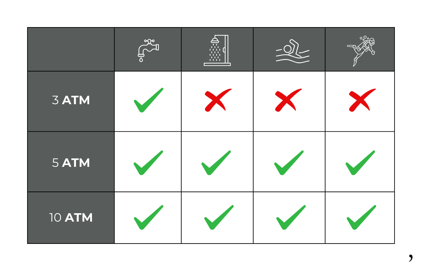 Some of our watches are water resistant to 3 ATM (30 meters), 5 ATM (50 meters) or 10 ATM (100 meters) . See the table below for instructions on how to use your watch in contact with water.