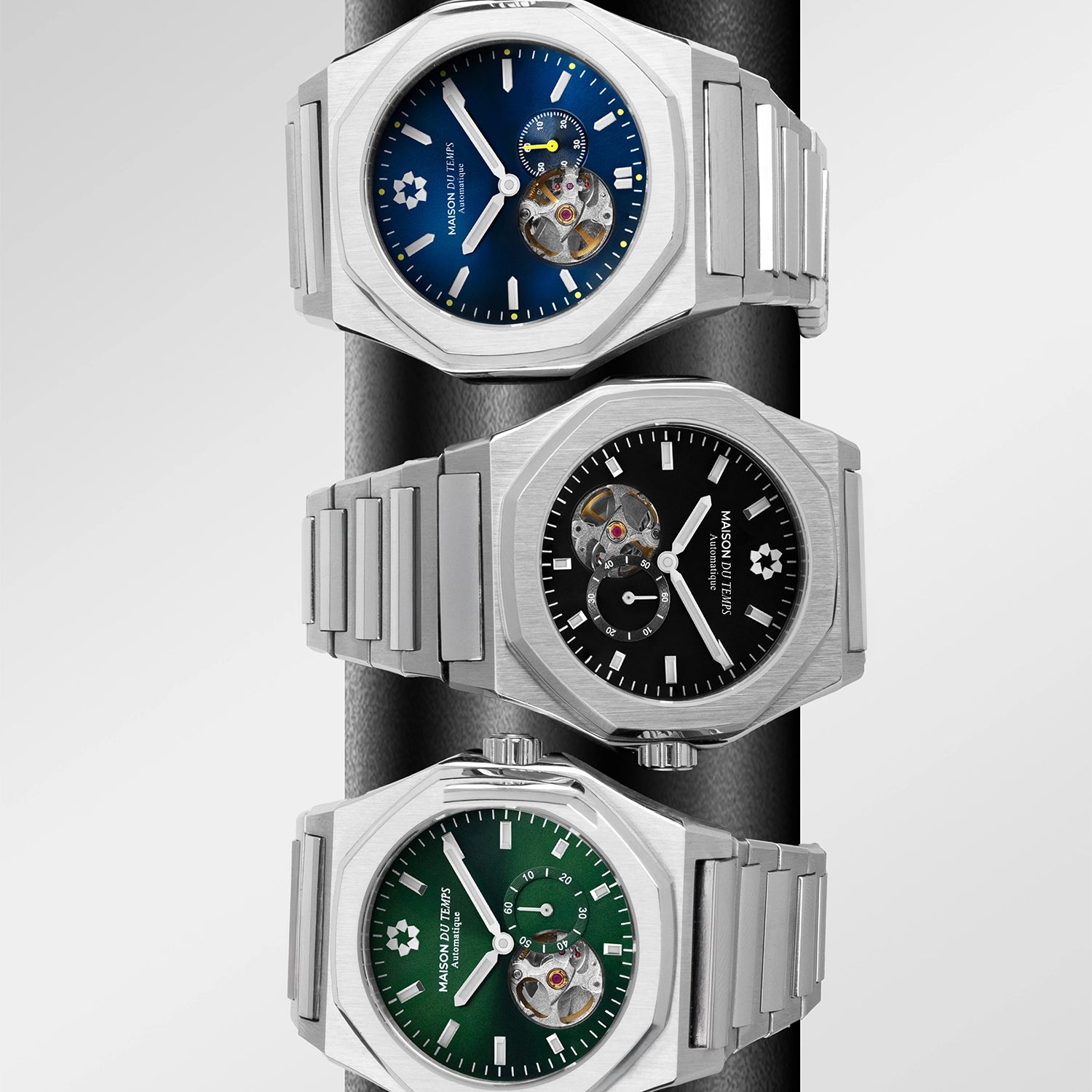 The MTDelta watch features a clean, sophisticated design with an open heart offering a direct view of the mechanism. Available in green or black, with steel or rubber straps, it adapts to your personal style.