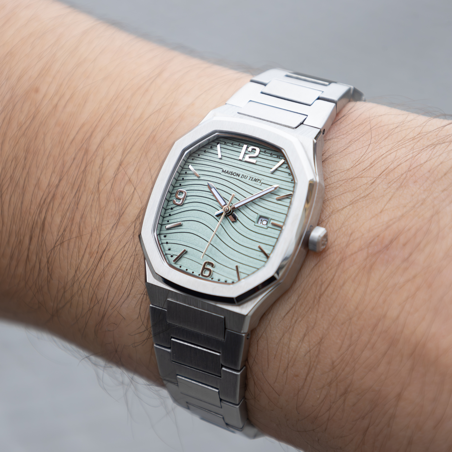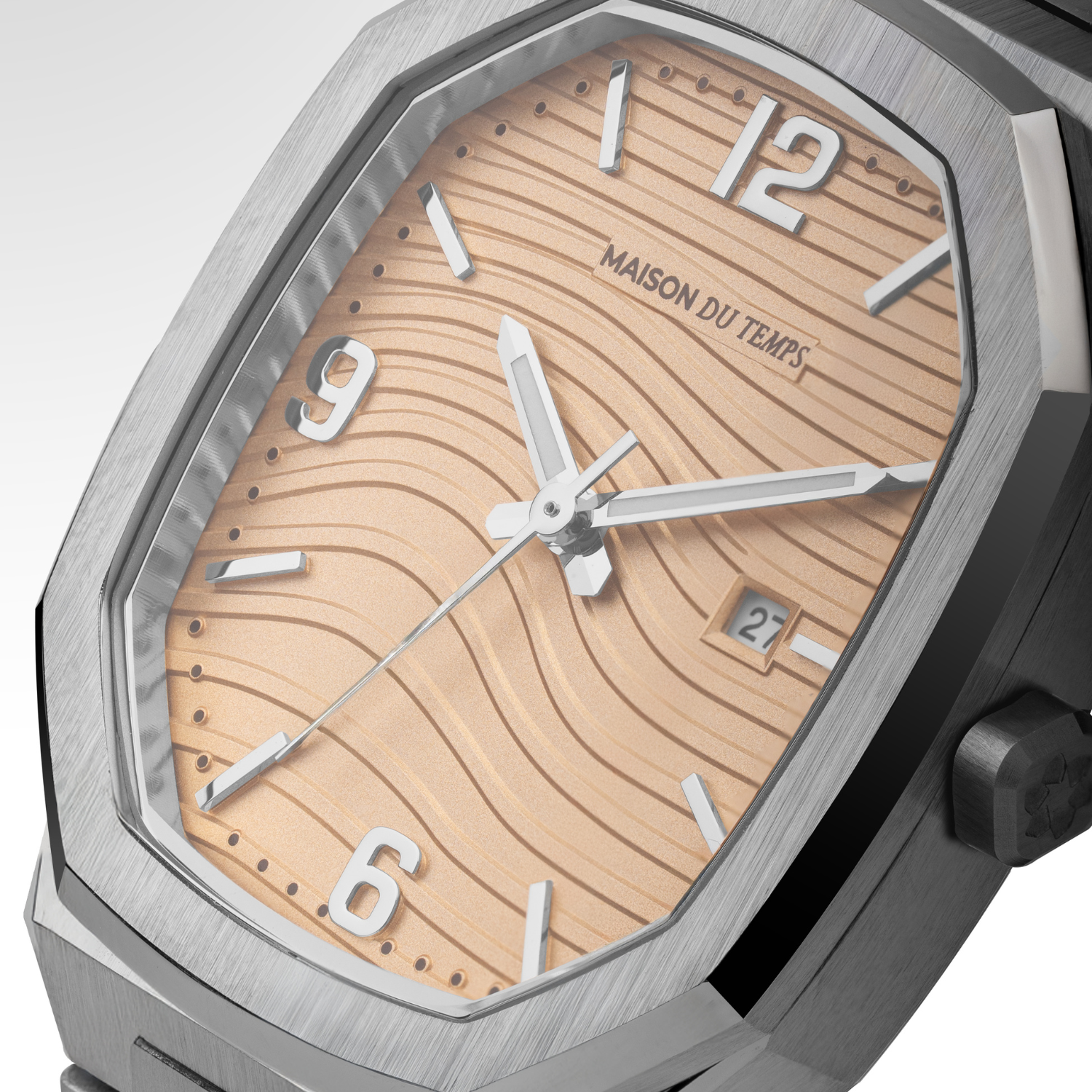 La MTPhi incarne l'expertise et le savoir-faire de MaisonDuTemps. Son cadran, orné de motifs en vagues, est le fruit d'un travail de recherche approfondi mené par notre équipe de design. Ce cadran unique allie esthétique et originalité tout en offrant une lisibilité optimale grâce à ses chiffres distinctifs 6, 9 et 12.