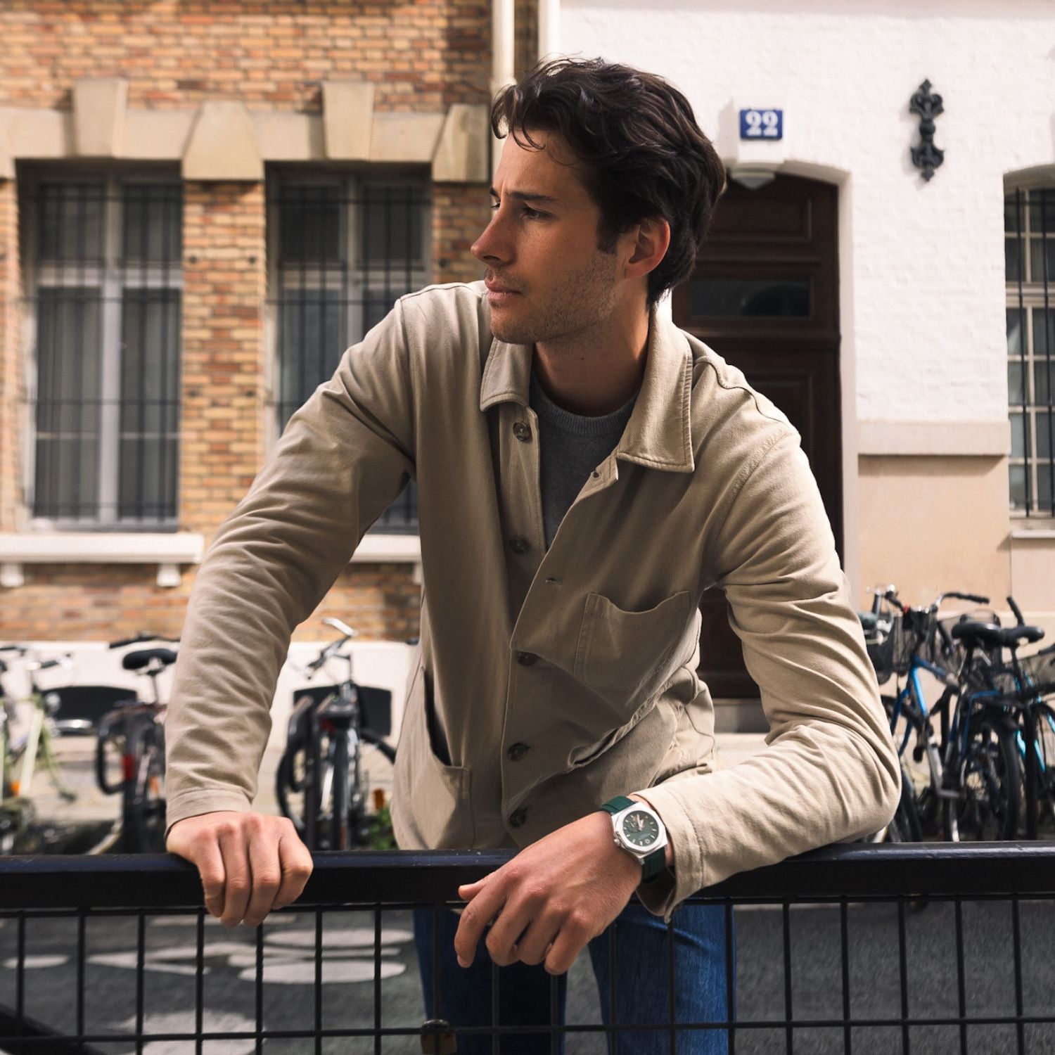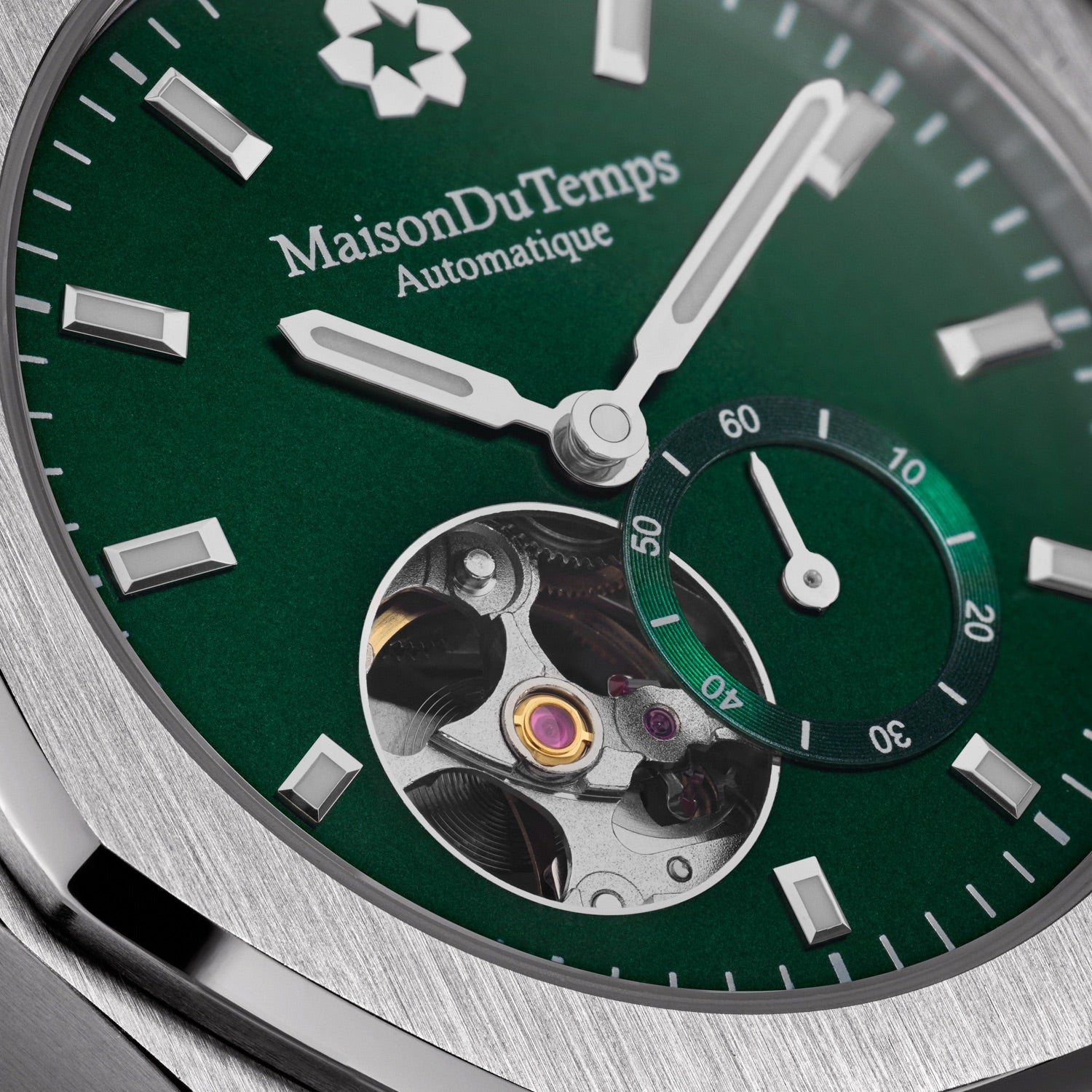 Avec sa teinte verte et son design mécanique, cette montre s'inscrit parfaitement dans notre gamme de montres à cœur ouvert pour homme.